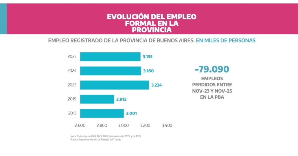 Las consecuencias de este proceso se reflejan con crudeza en el entramado productivo y laboral. Entre noviembre de 2023 y noviembre de 2025, la Provincia de Buenos Aires perdió 5.498 empresas y 79.090 puestos de trabajo formales registrados. A nivel nacional, la magnitud del ajuste es todavía mayor: en ese mismo período desaparecieron 21.046 empleadores y se perdieron 290.600 empleos formales. Estos números no hablan de eficiencia ni de modernización; hablan de empresas que cierran, de trabajadores expulsados del sistema y de un tejido productivo que se desarma.