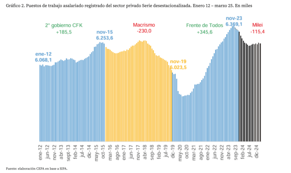 En el gobierno de Alberto, de nuevo tenemos algo de crecimiento de la economía, y una tasa nada despreciable de crecimiento del empleo registrado privado – que se desinfla en el último trimestre de 2023 a la luz del cambio de gobierno. En cambio, los periodos de Macri y de Mieli son de caída de la actividad y destrucción neta de empleos de este tipo. Incluso con Milei, a pesar de que ya cambió leyes laborales y de qué están pisando los salarios, la economía creció algo a principios de 2025 pero el empleo no, una paradoja que no era la norma. Durante muchos años y con leyes laborales como las que Milei quiere modificar, la actividad creció y el empleo también. Y esos años fueron peronistas.